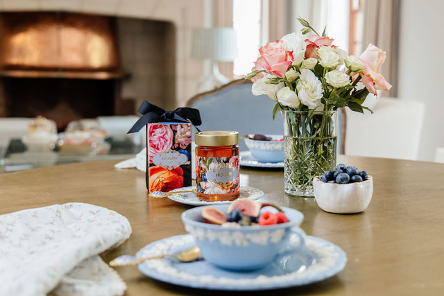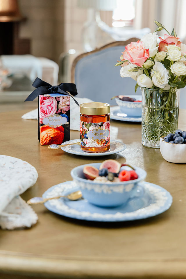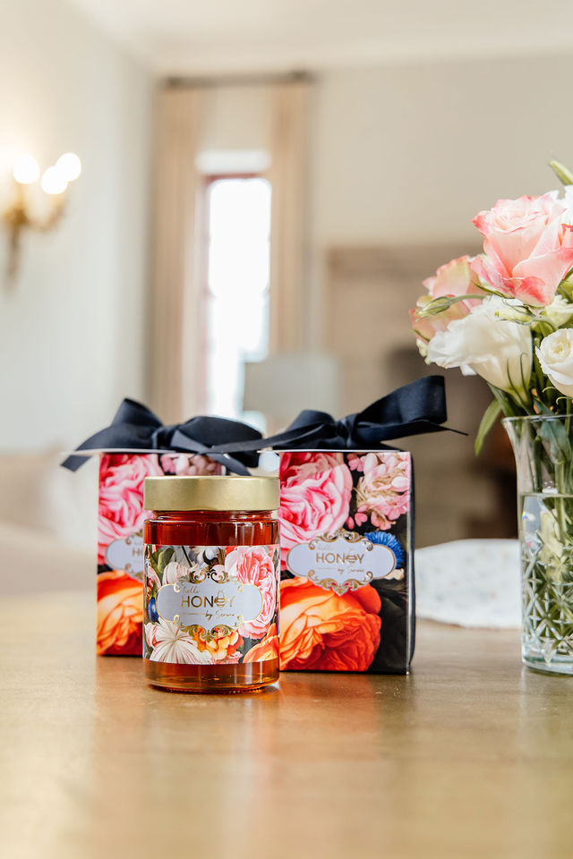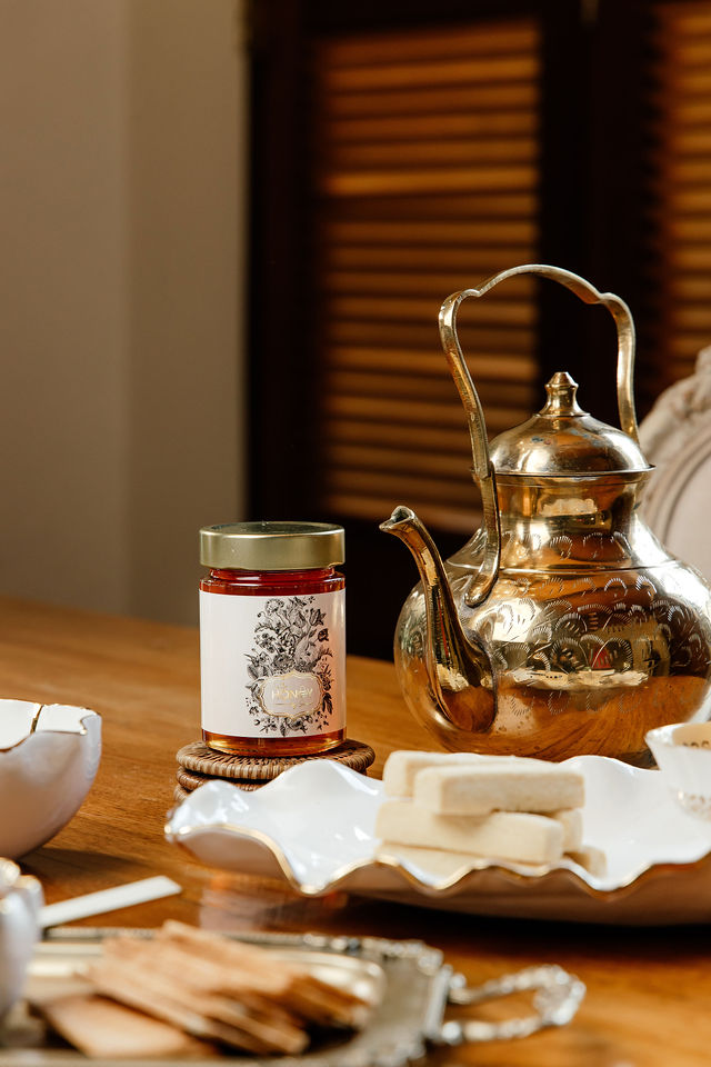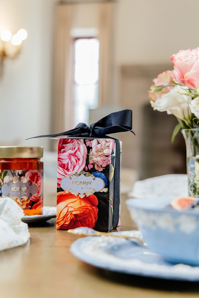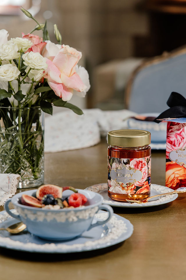Our Floral Grandeur honey jar is beautifully boxed in a rich, opulent floral print, featuring our Hello Honey logo in gold foil, on a soft blue background, with an option of a personalized Ramadhan & Eid tag