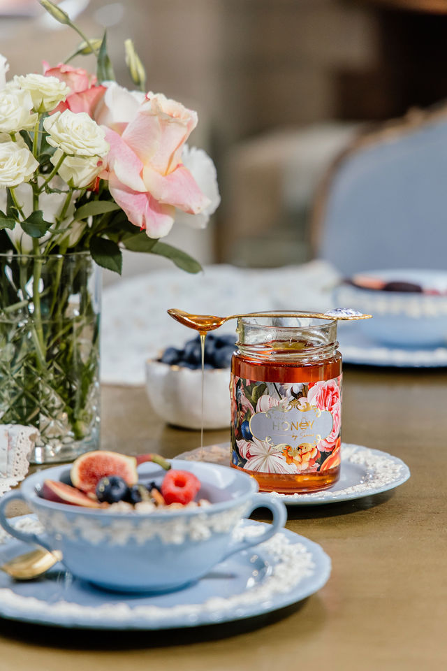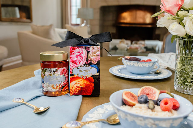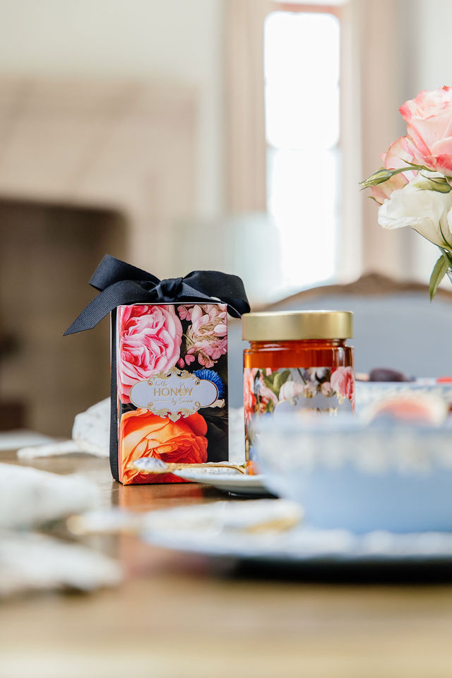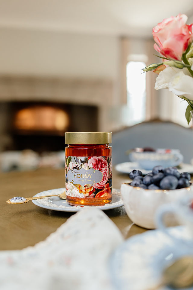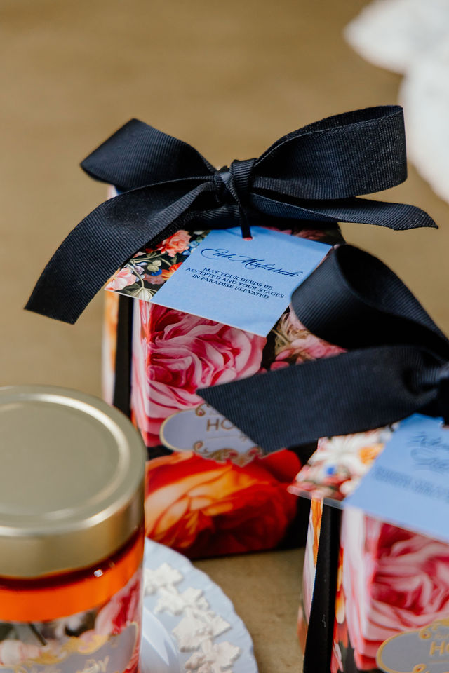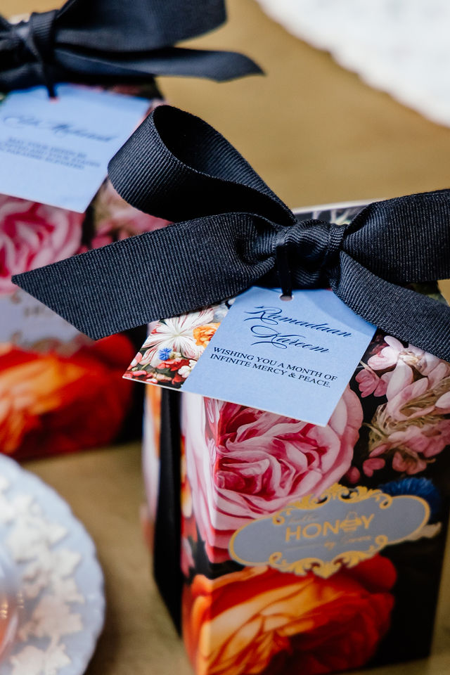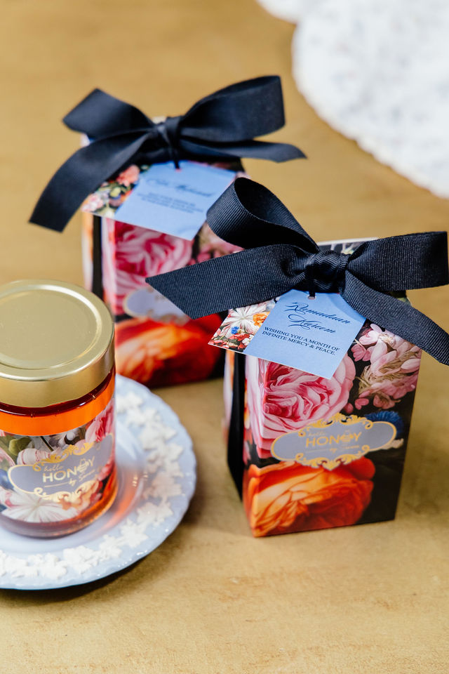 Our Floral Grandeur honey jar is beautifully boxed in a rich, opulent floral print, featuring our Hello Honey logo in gold foil, on a soft blue background, with an option of a personalized Ramadhan & Eid tag